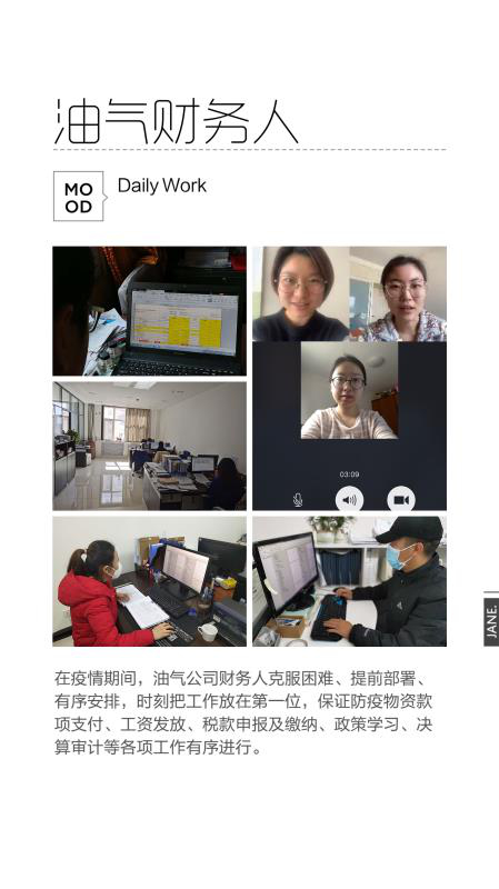 油氣公司財務部時刻把工作放在第一位,圓滿完成了防疫物資款項支付、工資發放、稅款申報、繳納和稅收優惠政策的學習與落實、決算審計事項的推進、各類報表的準時報送等工作。2月23日晚10時29分接到集團公司關于2月快報無法延期的通知,考慮到時間緊迫,即刻與三級子公司召開電話會議,各單位財務負責人均積極表示排除萬難,保證按時高效完成工作。會議結束已是晚上十一點半,會議中不時傳來了孩子們稚嫩的聲音,“寶寶先睡,媽媽要先把工作做完……。”在這個特殊的時期,有人家中無電腦,需要第二天去借;有人要把時間碎片化,高質量工作;有人在單位獲批部分復工名額時,第一個報名……